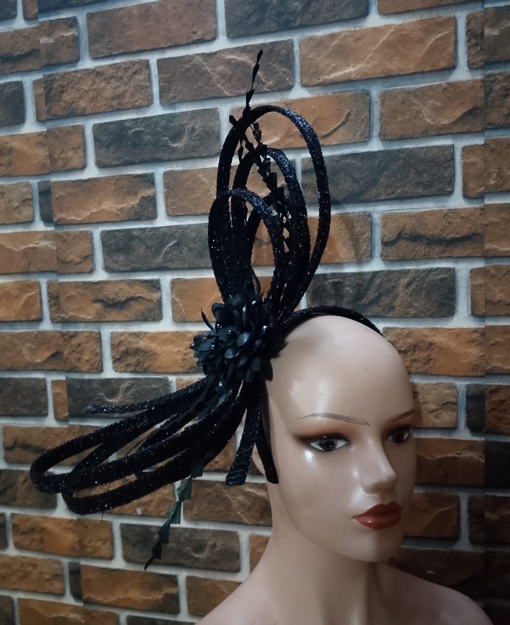 At the heart of the ‘Aura Burst’ Fascinator lies craftsmanship and detail tailored to perfection. The highly sculptural design features structured loops crafted from glittered cord and wire, creating a mesmerizing halo effect around the wearer’s head. Complemented by accent feathers and a handcrafted fabric flower appliqué, this masterpiece is both striking and wearable. From festive galas to elegant evening occasions, the design ensures every detail embodies sophistication and flair.